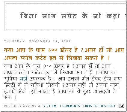 As I have been emphasising, Hindi blogs need to specialize. They also need to find niche markets where they remain unchallanged. Bina Laag Lapet Ke (Whithout Presumptions, or Without Hiding Anything) is such a website. Almost all articles are less than 200 words (most are less than 100) and mention niche subjects that nobody has thought about. A must-read for all, specially if you are short of time.